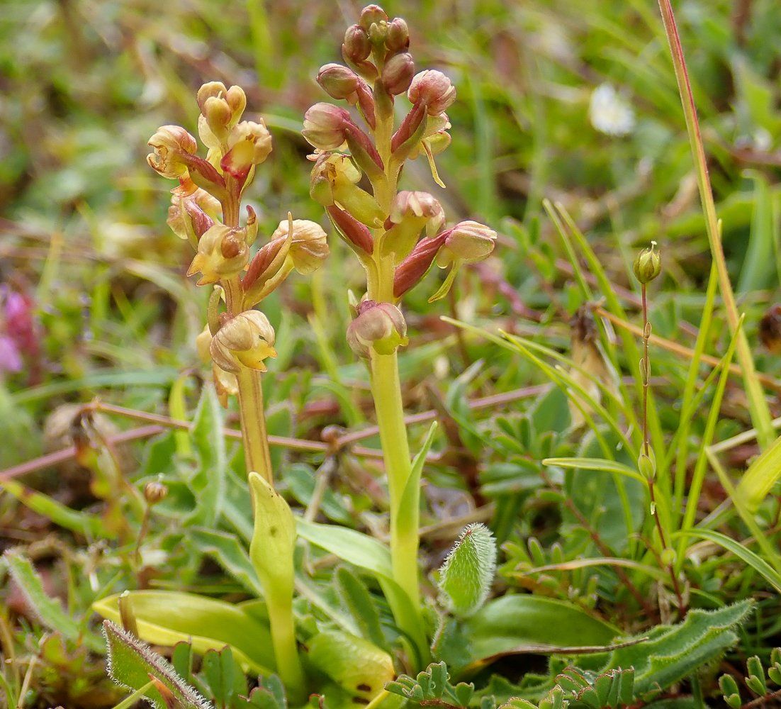 Frog Orchid Coeloglossum viride admired in very rich CG7 grassland by WBS members at Martin Down NNR, June 2022.