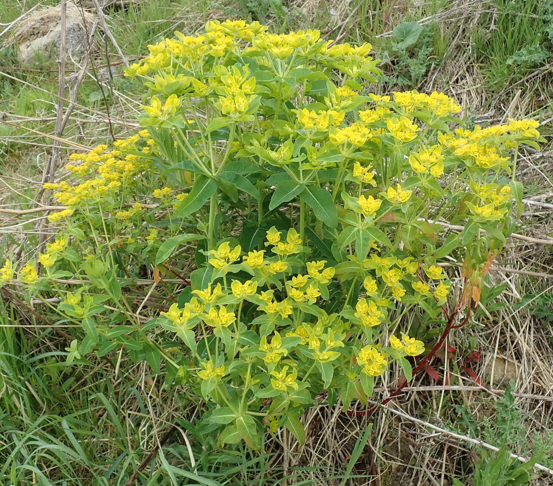 Balkan Spurge Euphorbia oblongata. A garden plant increasingly found naturalised, here in Westbury. April 2020. By Sharon Pilkington.