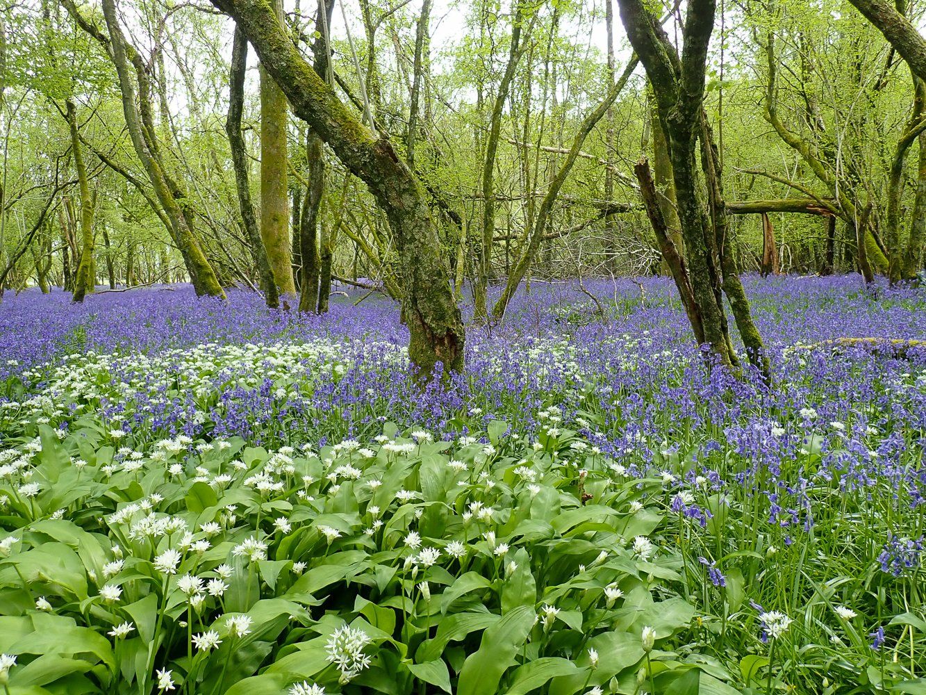 Ancient woodland at Tollard Royal with a splendid show of Bluebell Hyacinthoides non-scripta and Ramsons Allium ursinum in April 2022.